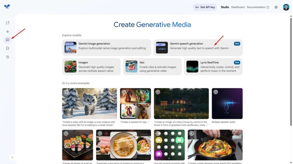 จากแถบเมนูด้านซ้าย ให้เลือก “Generate Media” แล้วคลิก “Generate speech generation”