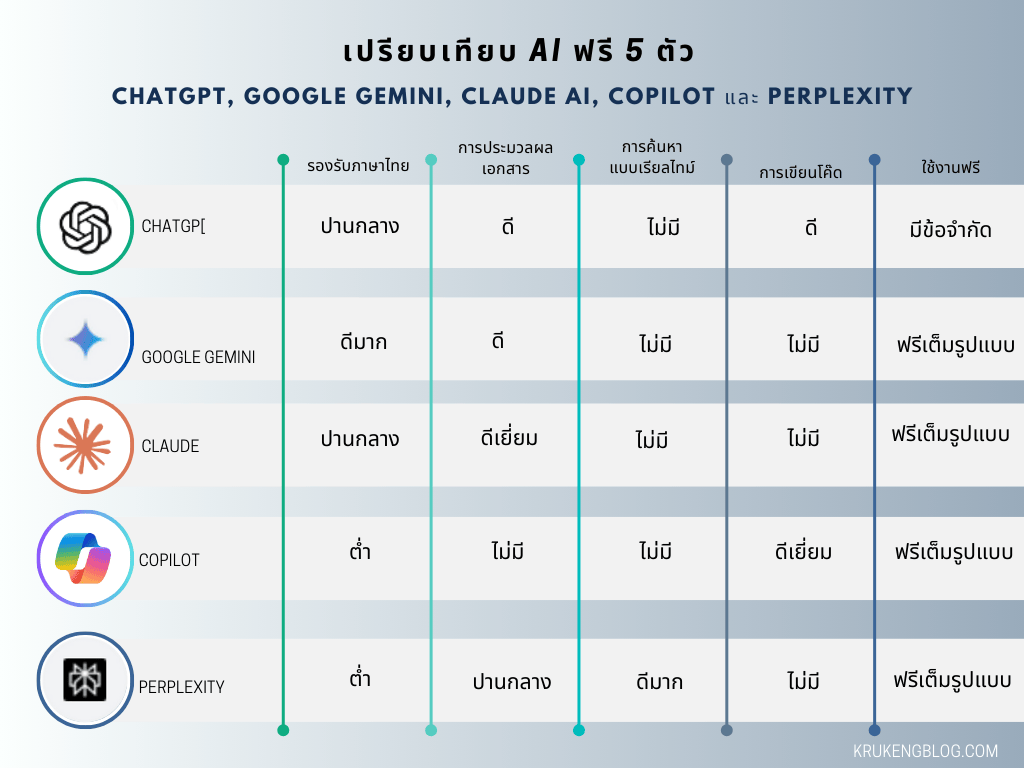 ในยุคปัจจุบัน AI กลายเป็นเครื่องมือสำคัญที่ช่วยเพิ่มประสิทธิภาพในงานและการเรียนรู้ บทความนี้จะเปรียบเทียบ AI ฟรี 5 ตัว ได้แก่ ChatGPT, Google Gemini, Claude AI, Copilot และ Perplexity AI เพื่อช่วยคุณเลือก AI ที่ตอบโจทย์ความต้องการที่สุด